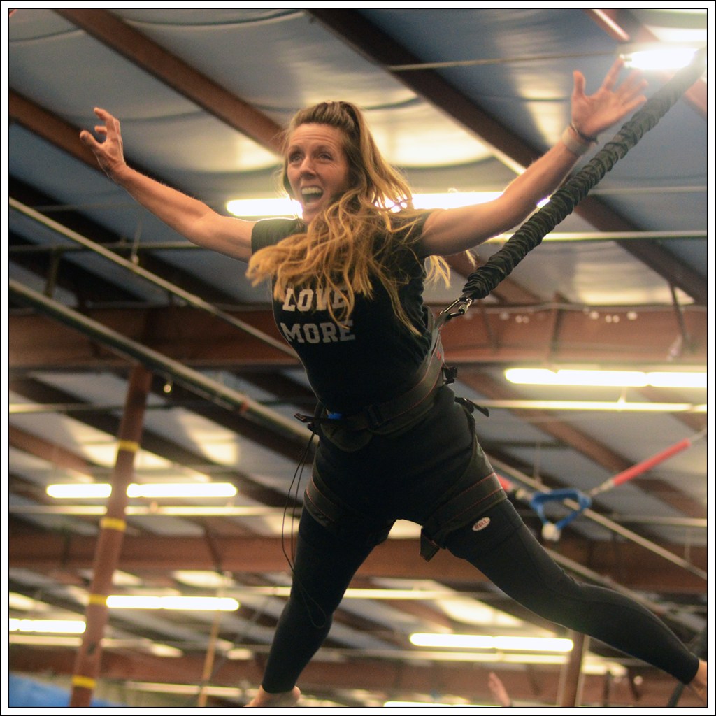 The gear fitting process may take 10-15 minutes at the start of class. With safety checks complete, it’s time to fly! Your instructor will begin the class up with movement sequences designed to help students get to know the feel and pull of the bungee while warming up the muscles. Once you’re warm, the class will start to really take off as we work up to soaring, leaping and diving through the air. The 45 minute class will include plenty of opportunities for water breaks, and you’ll need them!